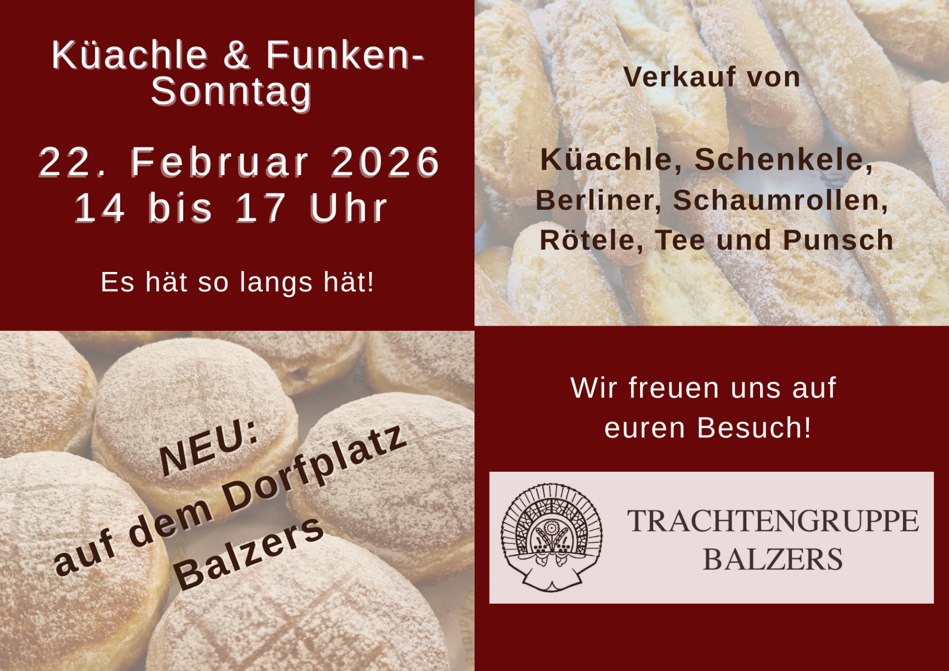 Verkauf von Küachle, Schenkele, Berliner, Schaumrollen, Rötele, Punsch und Tee! Auf Euren Besuch freut sich die Trachtengruppe Balzers