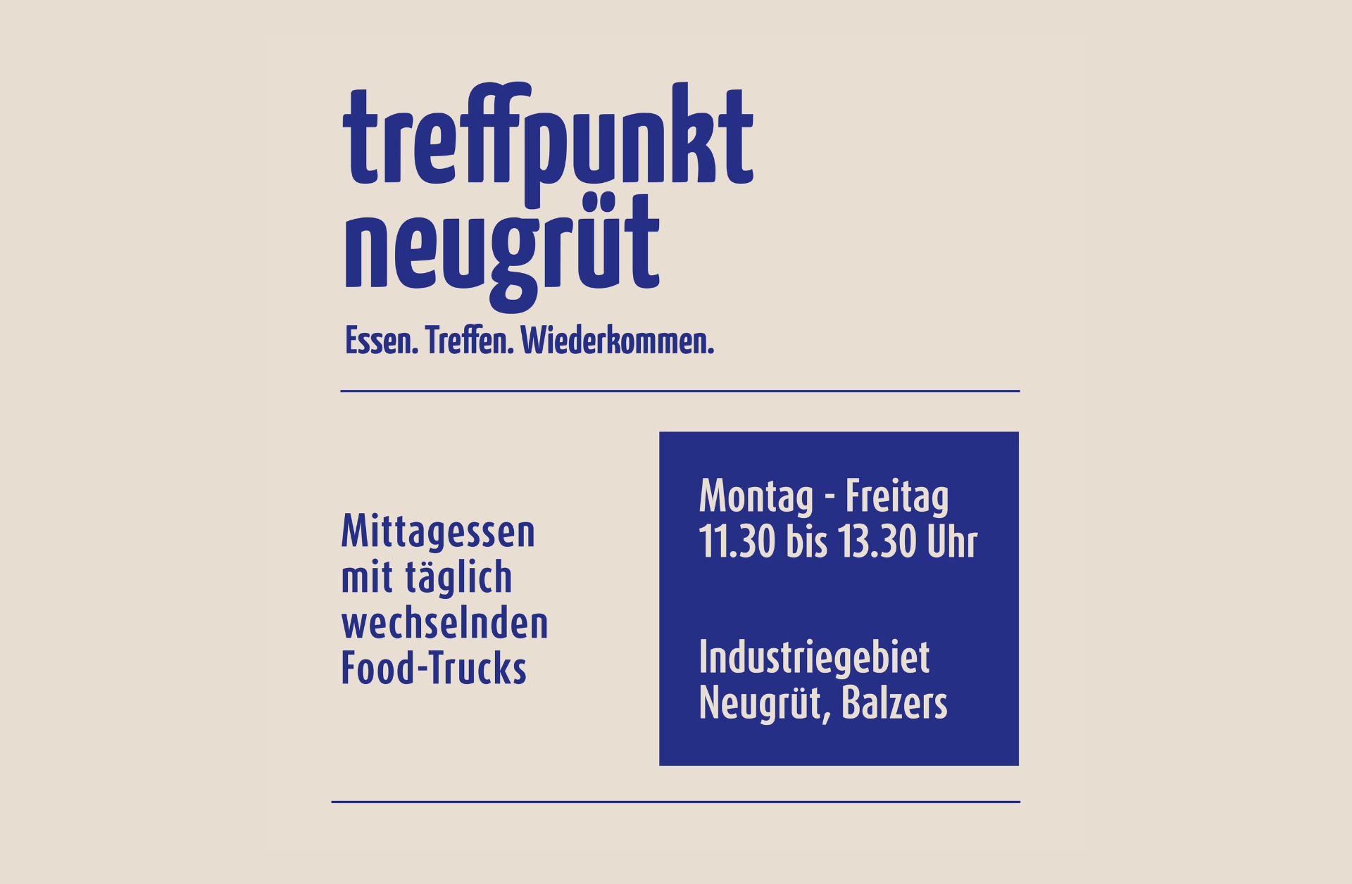 Unter dem Namen "Treffpunkt Neugrüt" startet die Wirtschaftskommission der Gemeinde Balzers ein Projekt, welches eine unkomplizierte Verpflegungsmöglichkeit ins Industriegebiet Neugrüt bringt. Auf dem Kiesparkplatz neben der Frickauto AG wird ein Holz-Pavillon an jedem Werktag von wechselnden Food-Trucks bewirtschaftet.