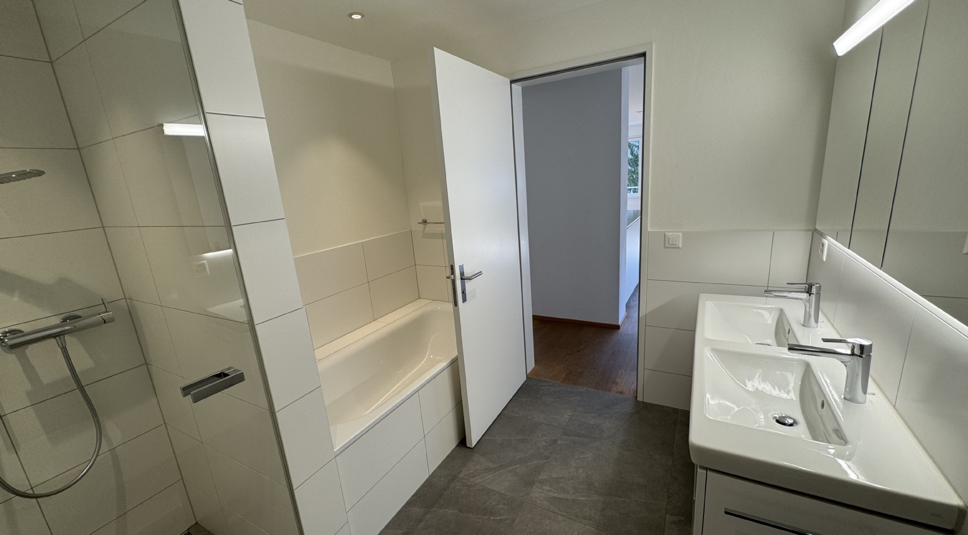Das zweite Bad verfügt sowohl über eine Dusche als auch eine Badewanne und bietet viel Platz.